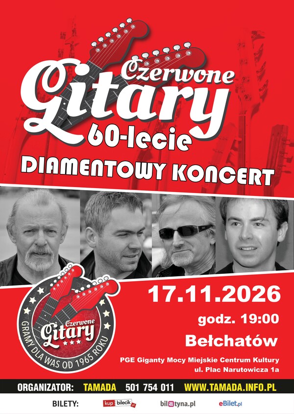 Miejskie Centrum Kultury w Bełchatowie zaprasza na koncert zespołu Czerwone Gitary, który odbędzie się 17 listopada 2026 r. o godzinie 19:00 w sali teatralno – widowiskowej MCK Giganty Mocy.