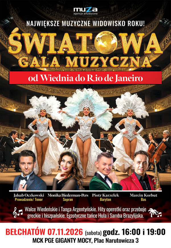 Miejskie Centrum Kultury w Bełchatowie zaprasza na koncert Światowej Gali Muzycznej - Od Wiednia do Rio de Janeiro, który odbędzie się 7 listopada 2026 r. o godzinie 16:00 i 19:00 w sali teatralno – widowiskowej MCK Giganty Mocy.