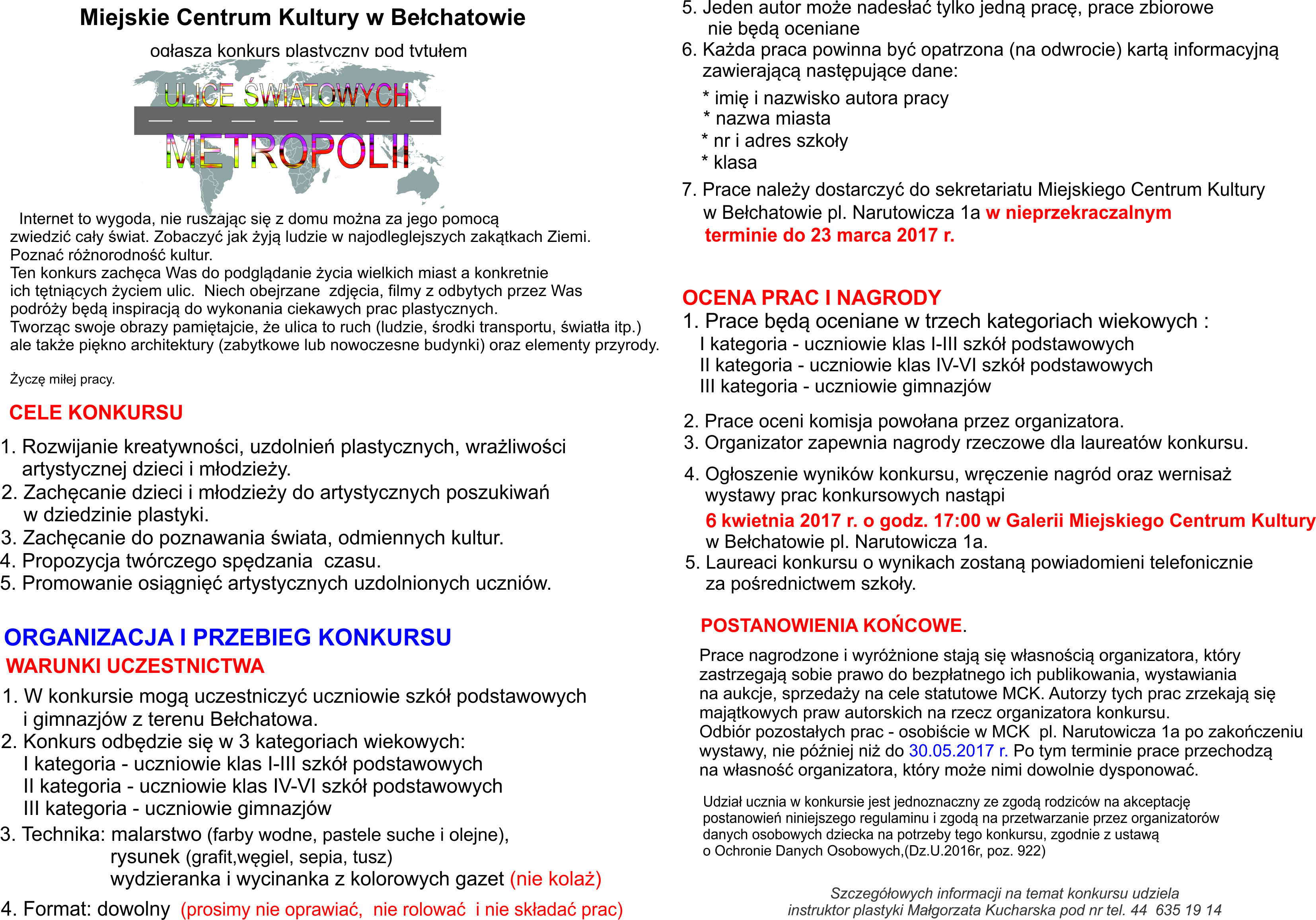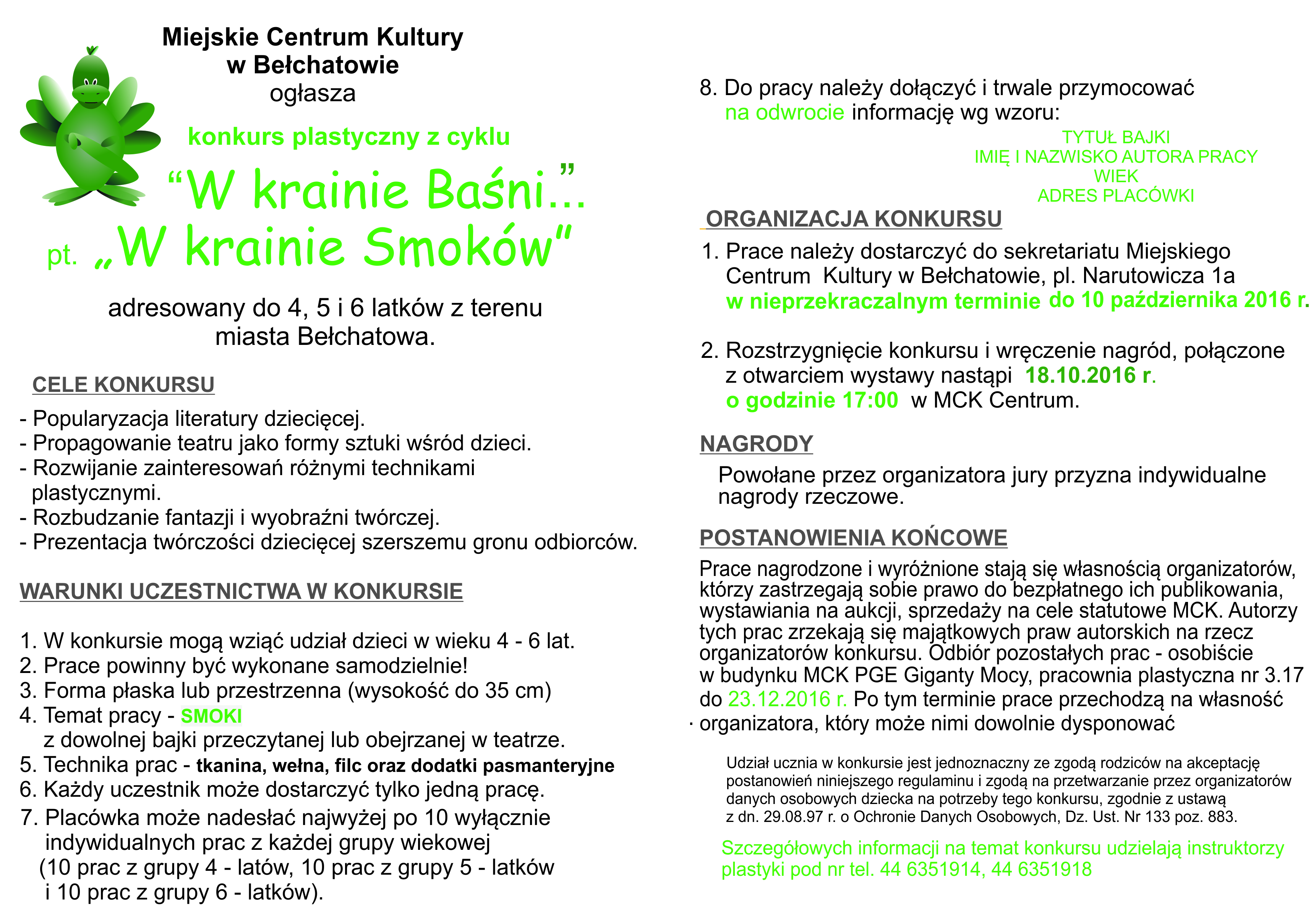 Prace należy dostarczyć 5 marca br. w godzinach 9:00-18:00, do pracowni plastycznej nr 3.17 w budynku MCK PGE Giganty Mocy w Bełchatowie, pl. Narutowicza 3.