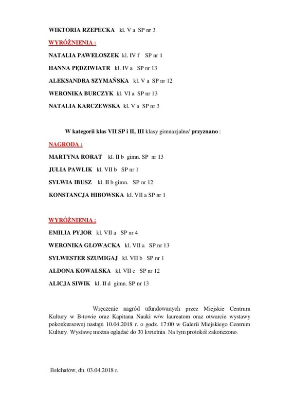 Rozstrzygnięcie konkursu i wręczenie nagród, połączone z otwarciem wystawy nastąpi dnia 12.03.2024 r. o godzinie 17:00 w Dolnym Foyer MCK PGE Giganty Mocy w Bełchatowie, pl. Narutowicza 3.