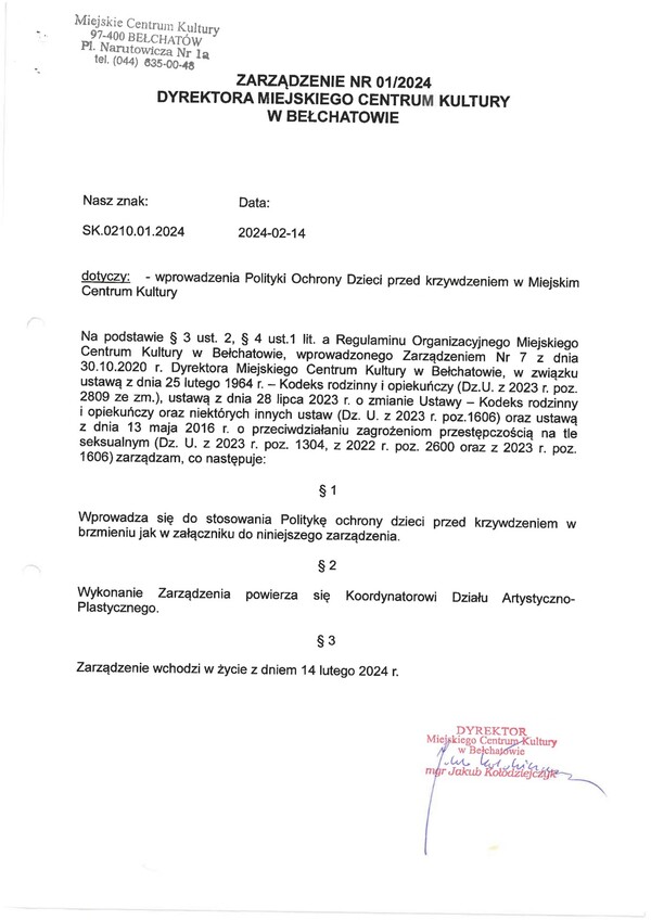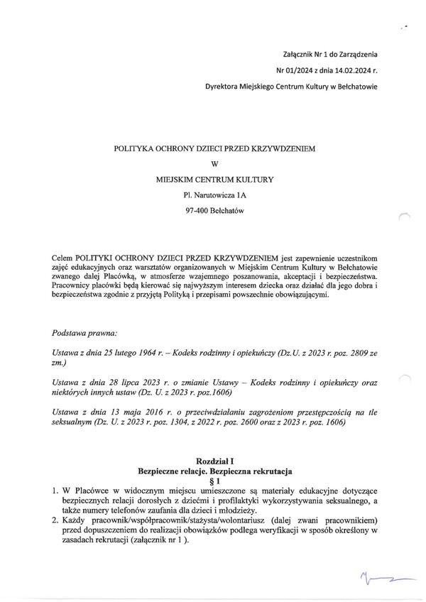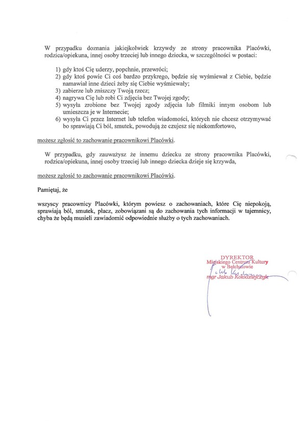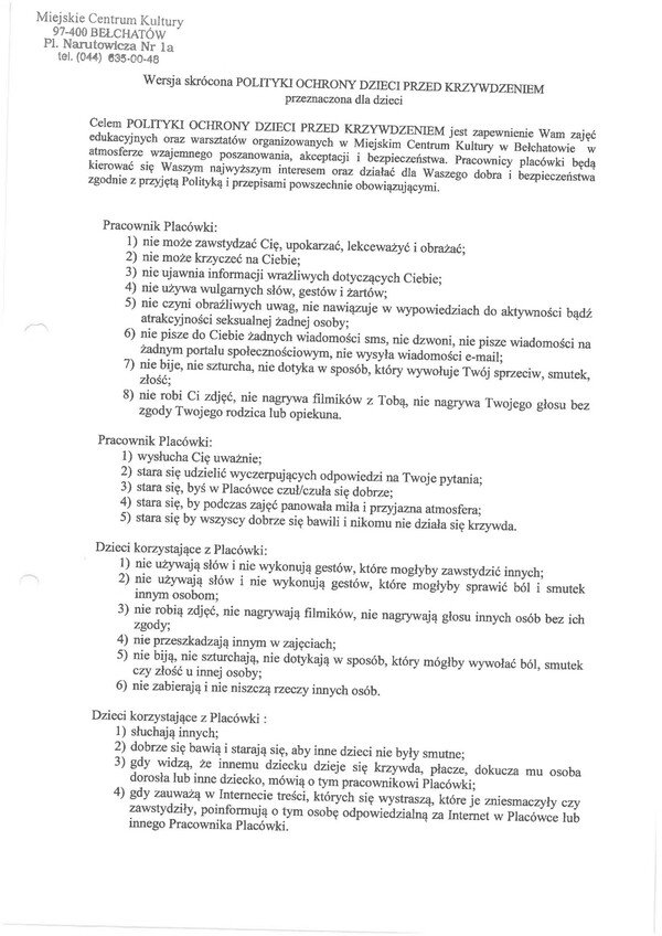 Polityka Ochrony Dzieci przed krzywdzeniem w Miejskim Centrum Kultury w Bełchatowie