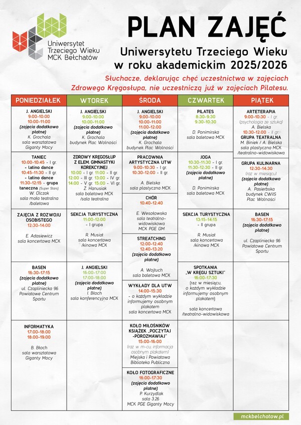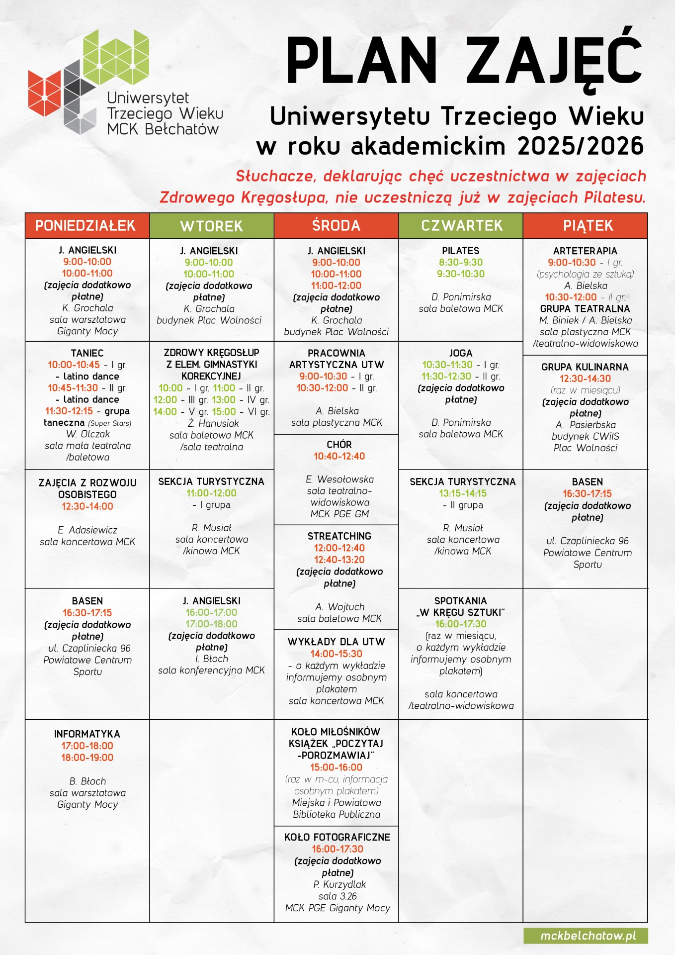 Zajęcia ze ZDROWEGO KRĘGOSŁUPA w dniu 21.10.2025r. dla Uniwersytetu Trzeciego Wieku odbędą się w sali baletowej ( budynek MCK Giganty Mocy, piwnice).