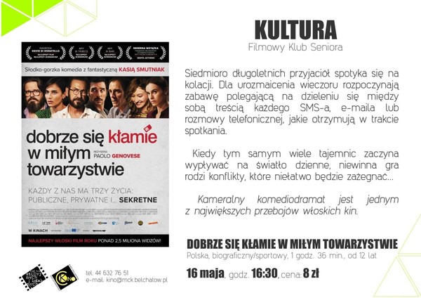 Miejskie Centrum Kultury zaprasza na seans w ramach Filmowego Klubu Seniora, który odbędzie się 16 maja o godzinie 16:30, w kinie KULTURA. Na ekranie zobaczymy film „Dobrze się kłamie w miłym towarzystwie”.