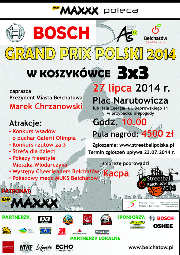 27 lipca 2014 r. do Bełchatowa zjadą najlepsi koszykarze 3x3 w kraju, którzy będą walczyli o nagrody pieniężne, prestiż oraz przede wszystkim o przepustki na turniej finałowy w Gdyni (16-17 sierpnia), który wyłoni mistrzów Polski w koszykówce ulicznej. Bełchatowski turniej, rozgrywany w kategorii open mężczyzn, odbędzie się w ramach cyklu Grand Prix Polski, na który składają się 23 turnieje. Rozgrywki trwają od maja do połowy sierpnia i odbywają się w każdy weekend w wybranych miastach Polski. Mecze toczyć będą się równolegle na 4 boiskach, w przypadku niepogody zawody przeniesione zostaną do Hali Energia (ul. Dąbrowskiego 11).