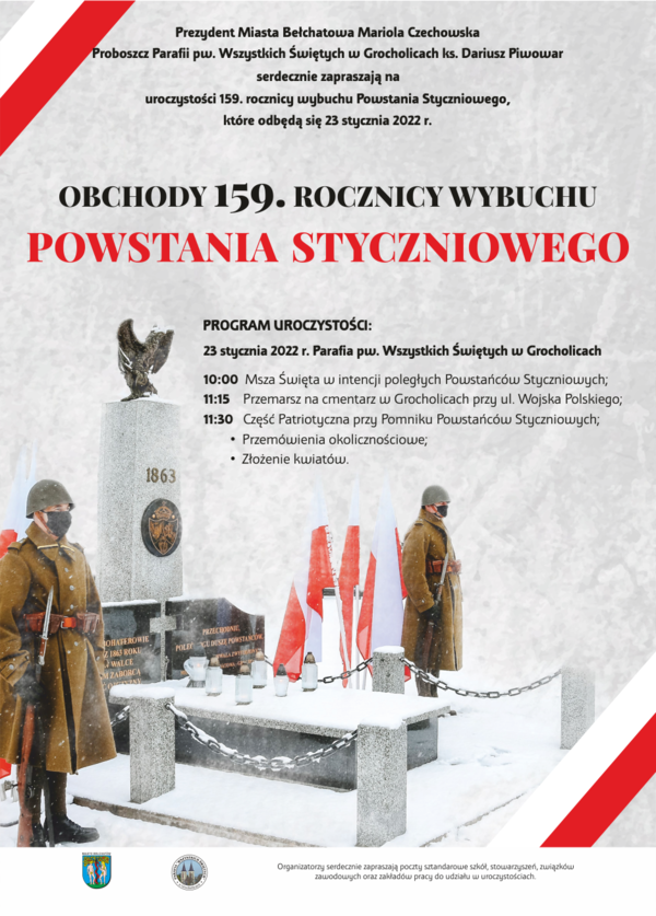 Prezydent Miasta Bełchatowa Mariola Czechowska, Proboszcz Parafii pw. Wszystkich Świętych w Grocholicach oraz ks. Dariusz Piwowar zapraszają na uroczystości 159. rocznicy wybuchu Powstania Styczniowego, które odbędą się 23 stycznia br.