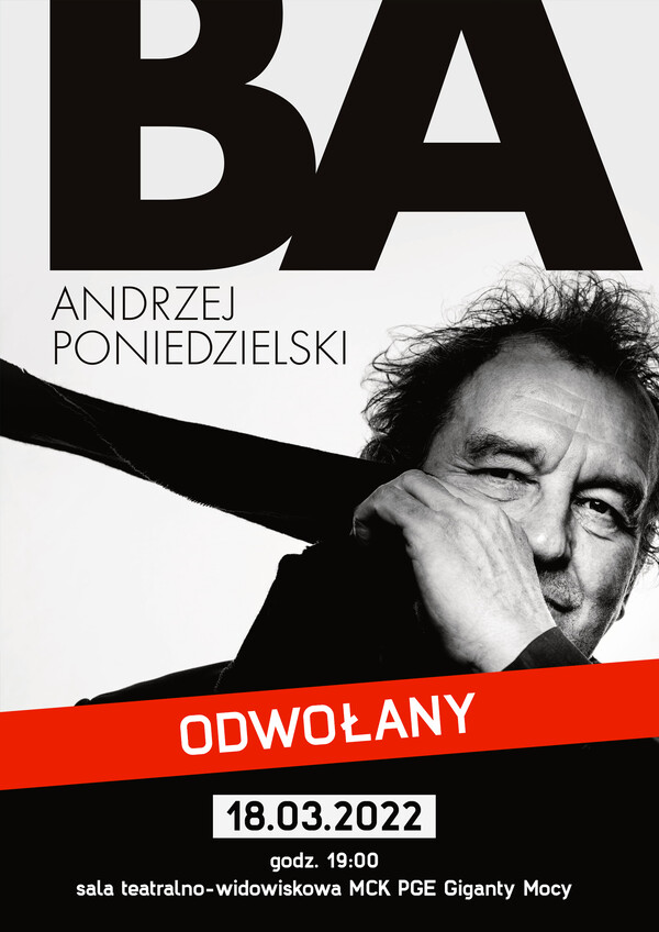 Z przykrością informujemy, że z przyczyn niezależnych od organizatora, zostaje odwołany występ Pana Andrzeja Poniedzielskiego, który miał się odbyć 18.03.2022 r. w sali teatralno-widowiskowej MCK PGE Giganty Mocy.