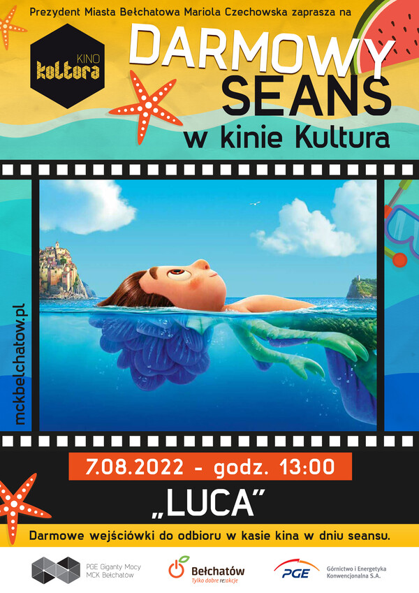 Prezydent Miasta Bełchatowa Mariola Czechowska zaprasza na darmowy seans w kinie Kultura, który odbędzie się 7 sierpnia br. o godzinie 13:00. Tym razem wyświetlimy dla Was animację „Luca”.