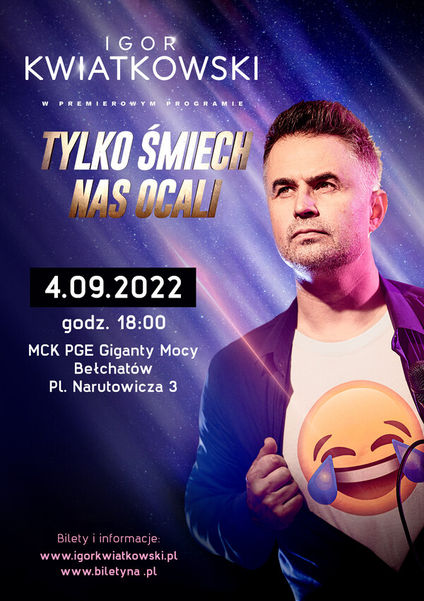 Miejskie Centrum Kultury w Bełchatowie zaprasza na występ Igora Kwiatkowskiego pt. „Tylko śmiech nas ocali”, który odbędzie się 4 września br. o godzinie 18:00 w sali teatralno – widowiskowej MCK PGE Giganty Mocy.