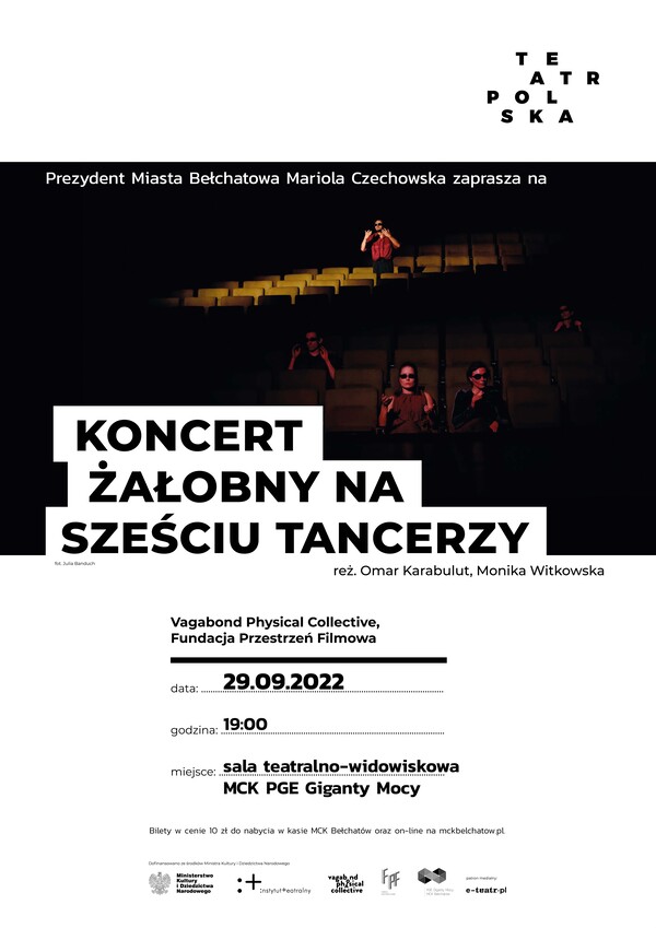 Fundacja Przestrzeń Filmowa oraz Prezydent Miasta Bełchatowa Mariola Czechowska zapraszają na spektakl Zespołu Vagabond Physical Collective pt. „Koncert żałobny na sześciu tancerzy”. Wydarzenie to będzie można obejrzeć na deskach sali teatralno – widowiskowej MCK PGE Giganty Mocy w dniu 29 września 2022, o godz. 19:00.