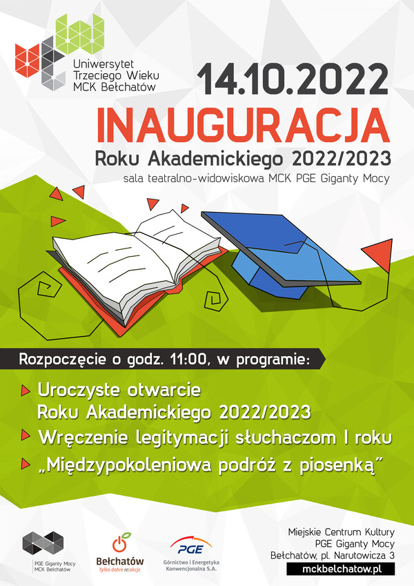 Miejskie Centrum Kultury w Bełchatowie zaprasza słuchaczy Uniwersytetu Trzeciego Wieku na uroczyste otwarcie nowego roku akademickiego 2022/2023, które odbędzie się 14 października o godzinie 11:00 w sali teatralno-widowiskowej MCK PGE Giganty Mocy.