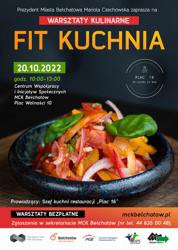 Prezydent Miasta Bełchatowa Mariola Czechowska zaprasza na warsztaty kulinarne„Fit Kuchnia”, które odbędą się 20 października br. o godzinie 10.00 w Centrum Współpracy i Inicjatyw Społecznych MCK Bełchatów przy Placu Wolności 10.