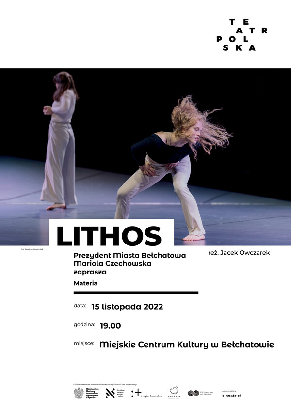 Prezydent Miasta Bełchatowa Mariola Czechowska oraz Materia Przestrzeń Tańca zapraszają na spektakl pt. „Lithos”, który odbędzie się 15 listopada o godzinie 19:00 w sali teatralno – widowiskowej MCK PGE Giganty Mocy.