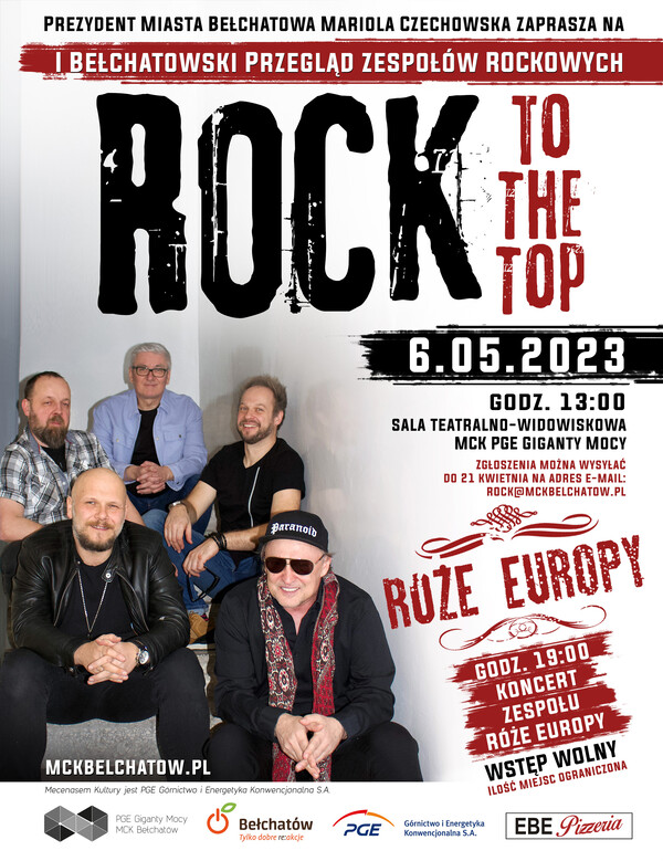 Zespół Róże Europy założył 13 grudnia 1983 roku, wieczorem, we wtorek, w trolejbusie linii Piaseczno – Warszawa, Piotr Klatt grający wcześniej w Lizakach Policyjnych i Lalkach Kaliguli (wokalista, gitarzysta, autor tekstów, dziennikarz muzyczny Telewizji Polskiej, Programu 3 Polskiego Radia i Radia Dla Ciebie). Obecnie zespół tworzą: Piotr Klatt, Bartek „Bartass” – Dębicki, Grzegorz Korybalski oraz Sebastian Górski. Róże Europy tworzą muzykę pełną autentyczności i uniwersalnego wielopokoleniowego przesłania. To lokomotywa szalonej muzyki połączona z rockową energią. Tak jest wszędzie gdzie grają. Lubią grać, a publiczność lubi się z nimi bawić. Jeśli chcecie w oryginale usłyszeć ich największe utwory takie jak: „Jedwab”, „Rock’n’rollowców” czy „Kontestatorów” to koniecznie wpadnijcie do nas 6 maja.