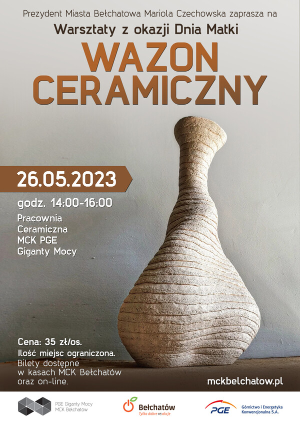 Prezydent Miasta Bełchatowa Mariola Czechowska zaprasza wszystkie mamy do wspólnego celebrowania Dnia Matki podczas warsztatów ceramicznych „Ceramiczny wazon”, które odbędą się 26 maja o godzinie 14:00 w pracowni ceramicznej MCK PGE Giganty Mocy.