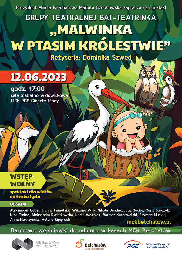 Prezydent Miasta Bełchatowa Mariola Czechowska zaprasza na spektakl pt. „Malwinka w ptasim królestwie” w wykonaniu grupy teatralnej BAT-TEATRINKA. Wydarzenie odbędzie się 12 czerwca br. o godzinie 17:00 w sali teatralno-widowiskowej MCK PGE Giganty Mocy.