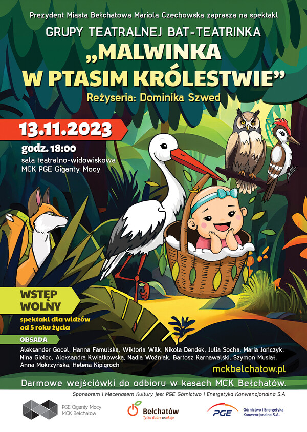 Prezydent Miasta Bełchatowa Mariola Czechowska zaprasza na spektakl pt. „Malwinka w ptasim królestwie” w wykonaniu grupy teatralnej BAT-Teatrinka. Wydarzenie odbędzie się 13 listopada br. o godzinie 18:00 w sali teatralno-widowiskowej MCK PGE Giganty Mocy.