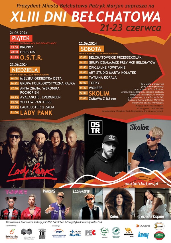 Tegoroczne Dni Bełchatowa rozpoczną się 21 czerwca i potrwają trzy dni. W piątek widzimy się na scenie plenerowej przy MCK PGE Giganty Mocy, gdzie czeka na nas wieczór z hip-hopem. Na scenie zobaczymy lokalnych artystów, zwycięzcę II Bełchatowskiego Przeglądu Hip-Hopowego „Hip Hop To The Top” – Herbiarza oraz gwiazdę wieczoru, rapera O.S.T.R. Dzień później przeniesiemy się na błonia przy Muzeum Regionalnym. Sobota będzie dniem disco, a świetną zabawę zapewnią Topky i Skolim. Na scenie pojawi się również bełchatowianka Tatiana Kopala. W niedzielę zapraszamy wielbicieli dobrego rockowego brzmienia. Wystąpią dla Was m.in. zwycięzcy II Bełchatowskiego Przeglądu zespołów rockowych „Rock To The Top” – Avalanche, bełchatowskie artystki Anna Zimna i Weronika Pochopień, Lackluster i Zalia oraz gwiazda wieczoru zespół Lady Pank.