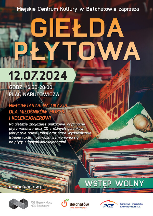 Miejskie Centrum Kultury w Bełchatowie zaprasza na Giełdę Płytową, która odbędzie się 12 lipca br. o godzinie 16:00 na Placu Narutowicza.