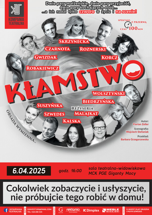 Miejskie Centrum Kultury w Bełchatowie zaprasza na spektakl pt. „Kłamstwo”, który odbędzie się 6 kwietnia 2025 r. o godzinie 16:00 w sali teatralno – widowiskowej MCK PGE Giganty Mocy.