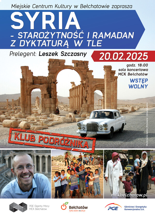 Miejskie Centrum Kultury w Bełchatowie zaprasza na spotkanie Klubu Podróżnika pt. „Syria - starożytność i ramadan z dyktaturą w tle”. Wydarzenie odbędzie się 20 lutego br. o godzinie 18:00 w sali koncertowej MCK.