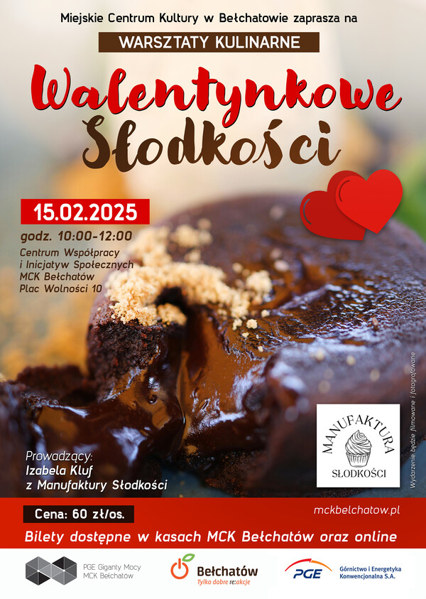 Miejskie Centrum Kultury w Bełchatowie zaprasza na warsztaty kulinarne „Walentynkowe Słodkości”, które odbędą się 15 lutego br. o godzinie 10:00 w Centrum Współpracy i Inicjatyw Społecznych MCK Bełchatów Plac Wolności 10.