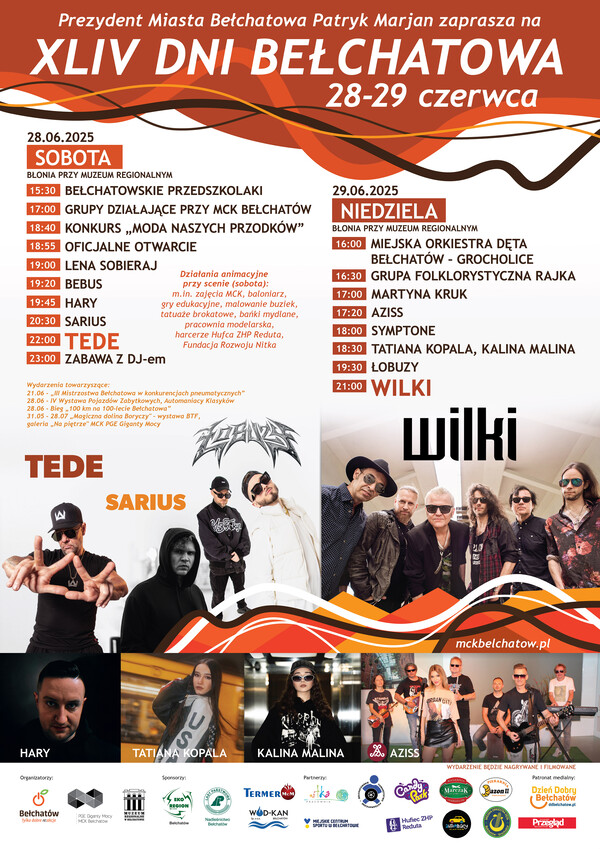 W sobotę naszą scenę zdominują hip-hopowe rytmy. Wystąpią dla Was m.in. Sarius, Tede, Hary, Bebus oraz bełchatowianka odnosząca sukcesy na popularnej platformie tik-tok - Leny Sobieraj, zaś wieczór zakończy energetyczny set DJ-a. Niedziela to kolejna porcja muzycznych emocji – wystąpią Tatiana Kopala z gościnnym udziałem Kaliny Maliny, Łobuzy, a zwieńczeniem wydarzenia będzie koncert zespołu Wilki.