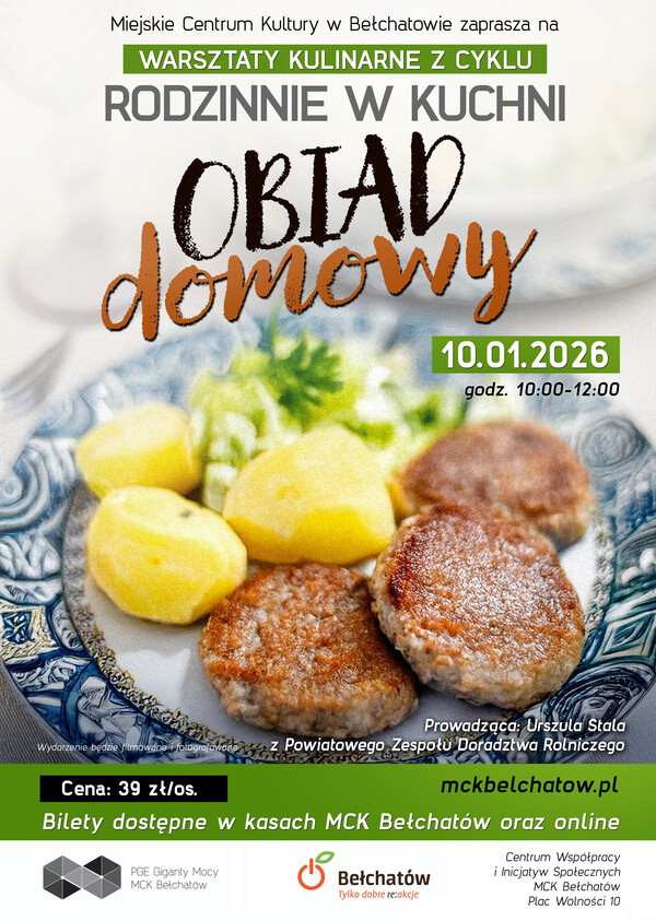 Miejskie Centrum Kultury zaprasza na warsztaty kulinarne pn. „Rodzinnie w kuchni – Obiad domowy”, które odbędą się 10 stycznia 2026 r. o godzinie 10:00 w Centrum Współpracy i Inicjatyw Społecznych przy Placu Wolności 10.
