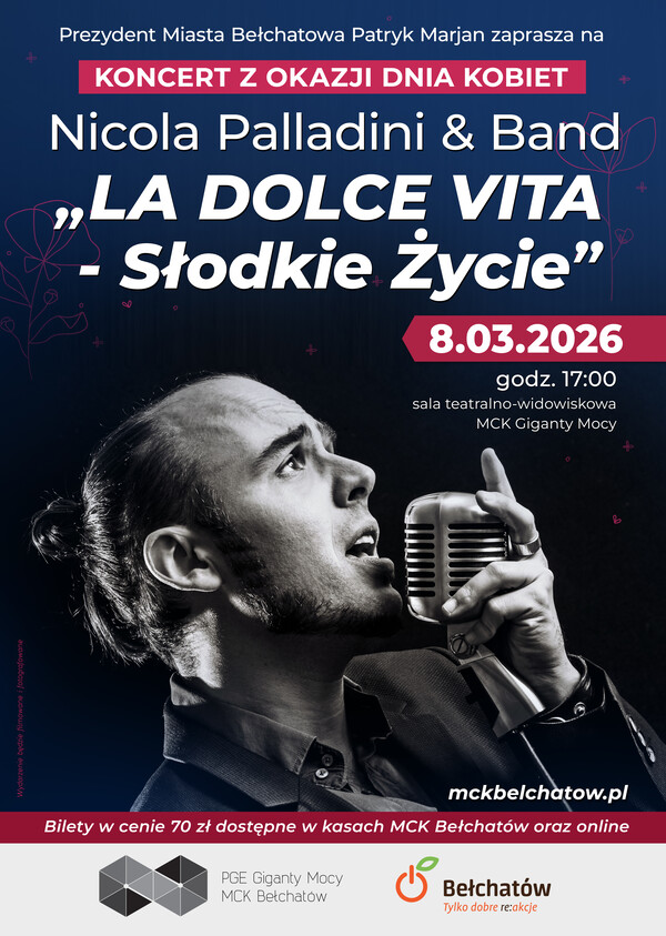 Prezydent Miasta Bełchatowa Patryk Marjan zaprasza na koncert z okazji Dnia Kobiet pn. „LA DOLCE VITA - Słodkie Życie”, który odbędzie się 8 marca br. o godzinie 17:00 w sali teatralno-widowiskowej MCK Giganty Mocy.