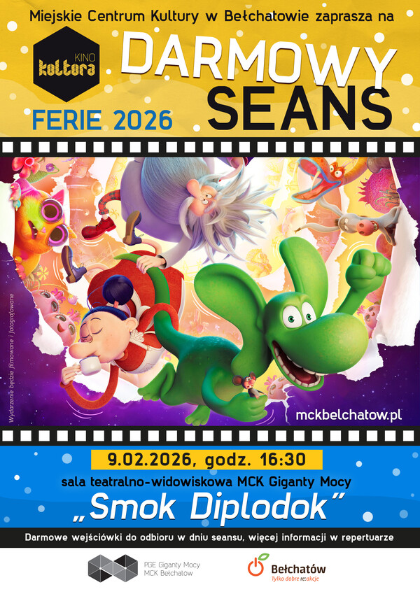 Miejskie Centrum Kultury w Bełchatowie zaprasza na darmowy seans animowany „Smok Diplodok”, który odbędzie się 9 lutego 2026 roku o godzinie 16:30 w sali teatralno-widowiskowej MCK Giganty Mocy.