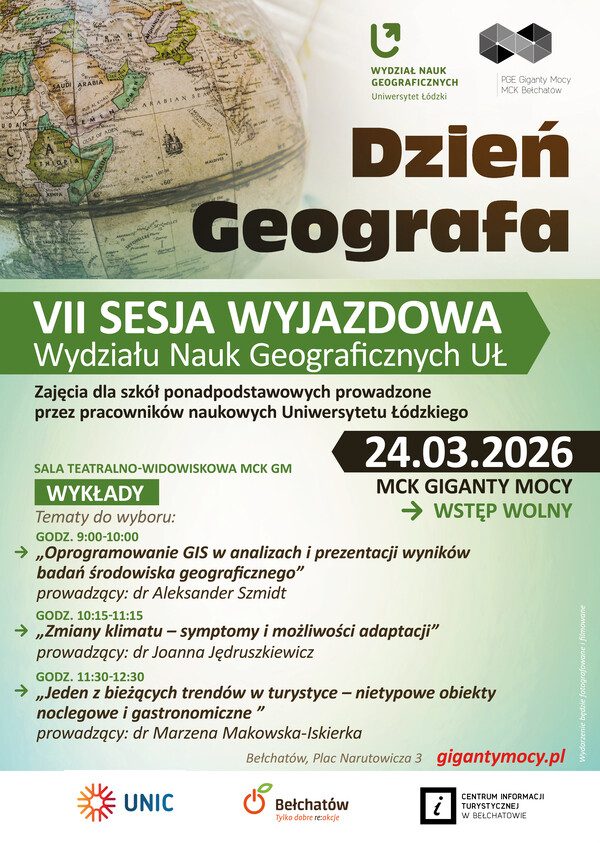 Miejskie Centrum Kultury w Bełchatowie zaprasza uczniów szkół średnich oraz nauczycieli na „Dzień Geografa” – VII Sesję Wyjazdową Wydziału Nauk Geograficznych Uniwersytetu Łódzkiego. Wydarzenie odbędzie się 24 marca 2026 roku w MCK Giganty Mocy i będzie okazją do spotkania z naukowcami oraz poznania współczesnych zagadnień związanych z geografią i środowiskiem.