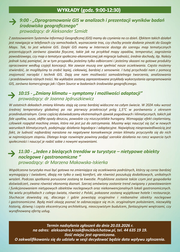Podczas spotkania uczestnicy wezmą udział w cyklu wykładów prowadzonych przez pracowników naukowych Uniwersytetu Łódzkiego. W programie znalazły się tematy dotyczące wykorzystania nowoczesnych technologii w badaniach środowiska, wyzwań związanych ze zmianami klimatu oraz aktualnych trendów w turystyce.