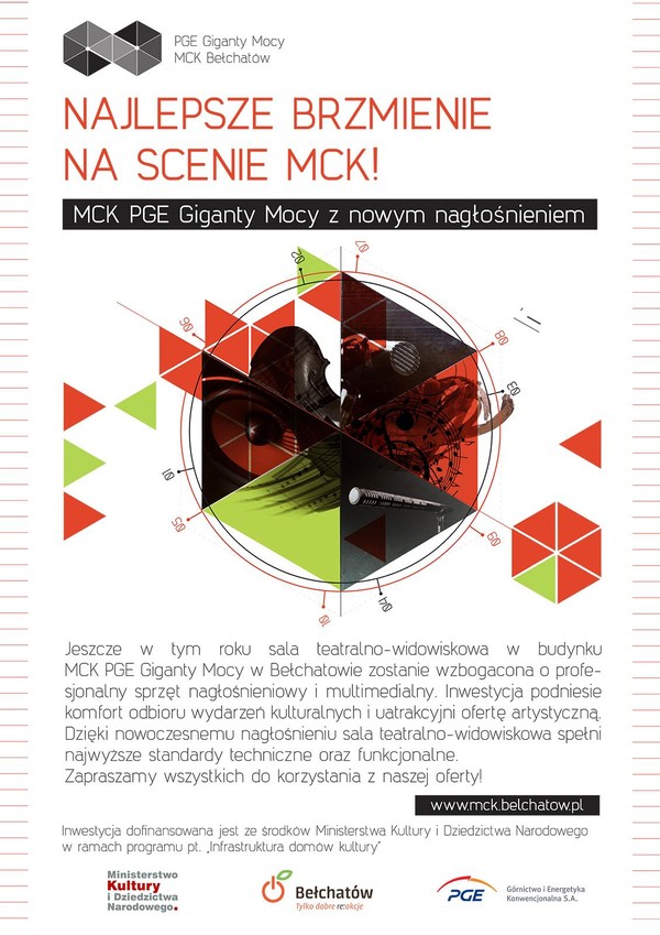 Jeszcze w tym roku sala teatralno-widowiskowa w budynku MCK PGE Giganty Mocy w Bełchatowie zostanie wzbogacona o profesjonalny sprzęt nagłośnieniowy i multimedialny. Inwestycja podniesie komfort odbioru wydarzeń kulturalnych i uatrakcyjni ofertę artystyczną. Dzięki nowoczesnemu nagłośnieniu sala teatralno-widowiskowa spełni najwyższe standardy techniczne oraz funkcjonalne.