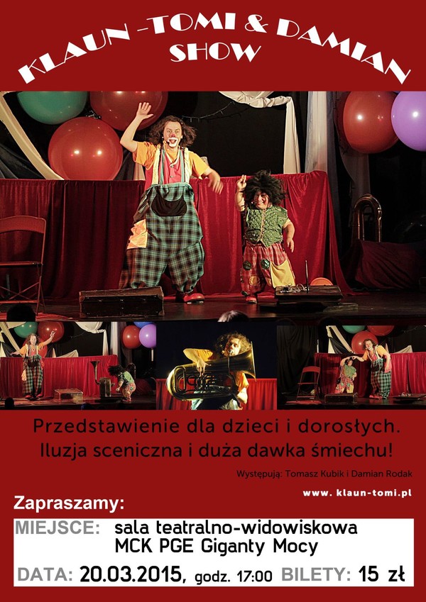 Zabawne gagi, śmieszne rekwizyty, sympatyczny klaun i mnóstwo dobrego humoru – to wszystko będzie czekać na dzieci podczas spektaklu „Przygód parę na klauna miarę”, który odbędzie się 20 marca o godzinie 17:00, w sali teatralno – widowiskowej MCK PGE Giganty Mocy.