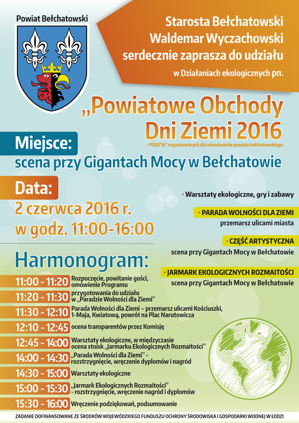 Starosta Powiatu Bełchatowskiego wraz z Miejskim Centrum Kultury zapraszają na największe ekologiczne święto w regionie. Już 2 czerwca na placu przy scenie plenerowej MCK PGE Gigantów Mocy odbędą się "Powiatowe Obchody Dni Ziemi". Festyn dedykowany jest wszystkim mieszkańcom, którym losy naszej planety nie są obojętne.