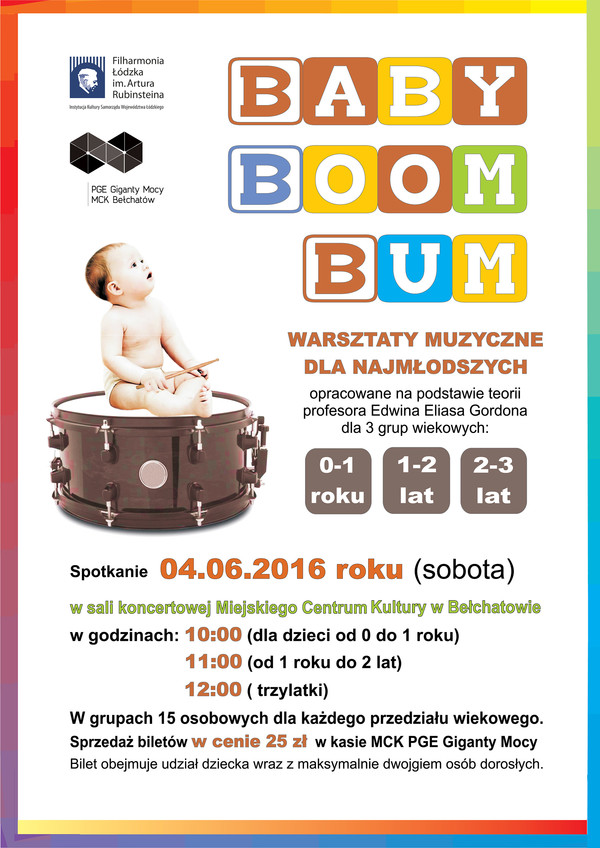 Miejskie Centrum Kultury w Bełchatowie zaprasza najmłodsze dzieci wraz z opiekunami do udziału w niesamowitych Warsztatach Muzycznych dla najmłodszych, prowadzonych przez instruktorów Filharmonii Łódzkiej im. Artura Rubinsteina. Zajęcia są skierowane dla trzech grup wiekowych: 0-1; 1-2; 2-3. Będą to ostatnie- pożegnalne warsztaty Baby Boom Bum.