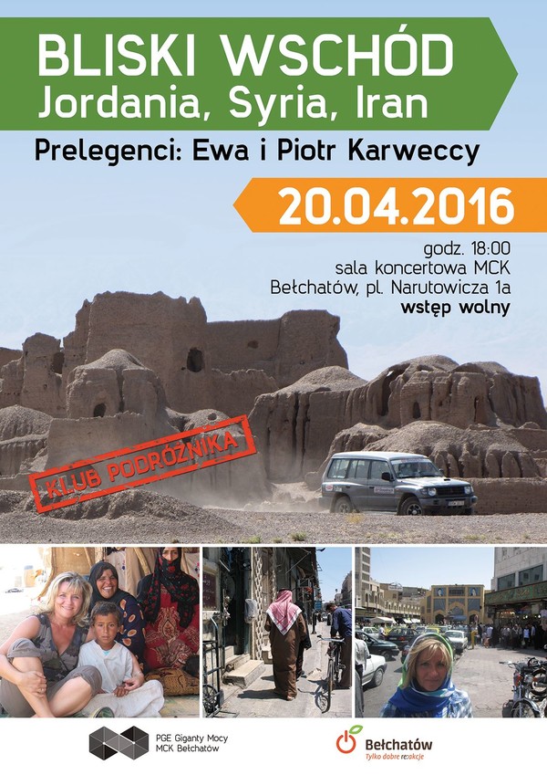 Miejskie Centrum Kultury w Bełchatowie zaprasza na kolejne spotkanie w Klubie Podróżnika, który zbierze się 20 kwietnia o godzinie 18:00 w sali koncertowej MCK. Podczas spotkania z Ewą i Piotrem Karweckimi przeniesiemy się na Bliski Wschód. Wstęp wolny.