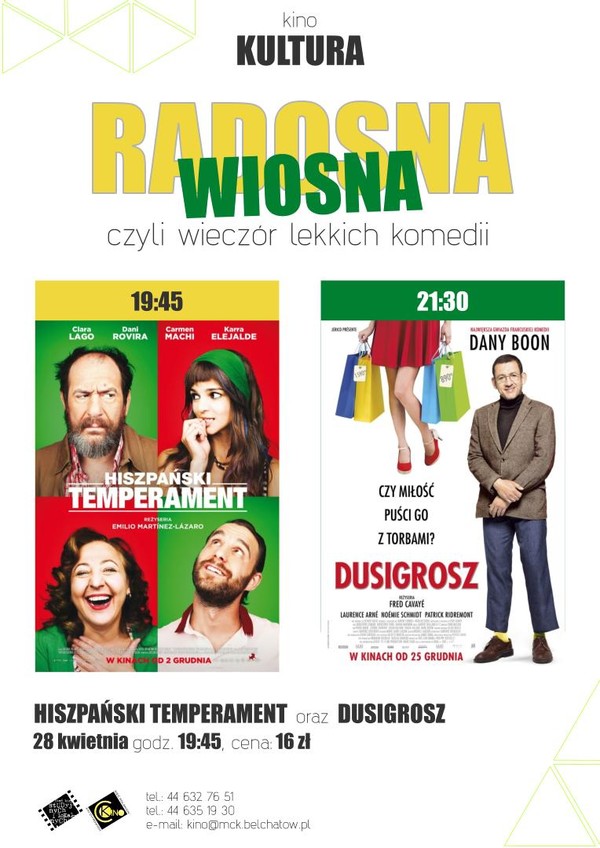 Miejskie Centrum Kultury w Bełchatowie zaprasza do kina KULTURA na „RADOSNĄ WIOSNĘ, czyli wieczór lekkich komedii”, który odbędzie się 28 kwietnia o godzinie 19:45.