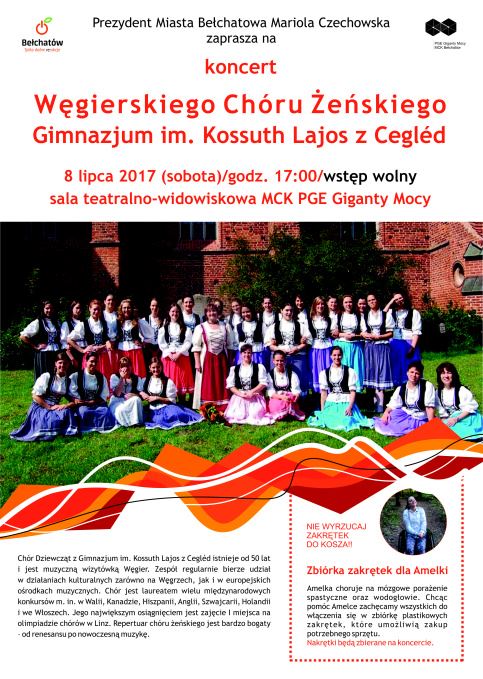 Prezydent Miasta Bełchatowa Mariola Czechowska zaprasza na koncert Węgierskiego Chóru Żeńskiego Gimnazjum im. Kossuth Lajos z Cegléd, który odbędzie się 8 lipca o godzinie 17:00, w sali teatralno - widowiskowej MCK PGE Giganty Mocy.