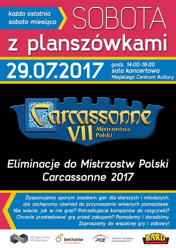 Tradycyjnie już, w ostatnią sobotę miesiąca, MCK stanie się areną planszówek. Lipcowe spotkanie będzie jednak wyjątkowe! Fani gry Carcassonne będą mogli wziąć udział w kwalifikacjach do Mistrzostw Polski Carcassonne 2017, organizowanych przez wydawnictwo Bard. Zwycięzcy bełchatowskich eliminacji zagwarantują sobie udział w finale Mistrzostw Polski i powalczą o główną nagrodę!