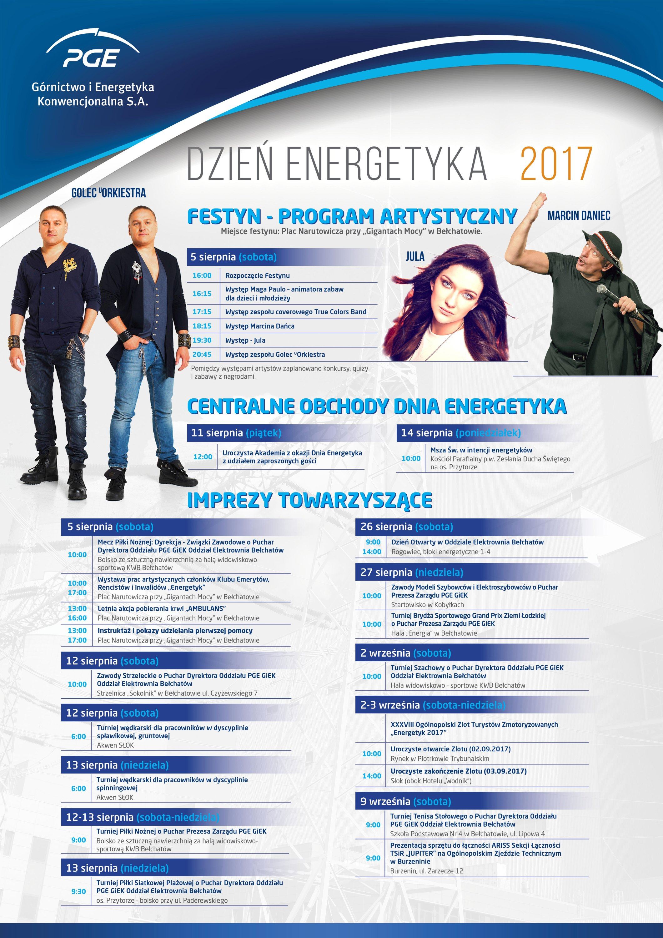 Tradycyjnie, jak w latach ubiegłych, bełchatowscy energetycy będą się bawić na plenerowym festynie, z okazji obchodów Dnia Energetyka. Gwiazdą tegorocznej edycji będzie popularna grupa „Golec uOrkiestra”. Liderami zespołu, znanego z takich hitów, jak: „Lornetka", "Słodycze" czy "Lornetka" są Łukasz oraz Paweł Golcowie. Zespół w oryginalny sposób łączy elementy góralskiego folku z charakterystycznymi cechami muzyki pop, rock'n'rolla i jazzu.