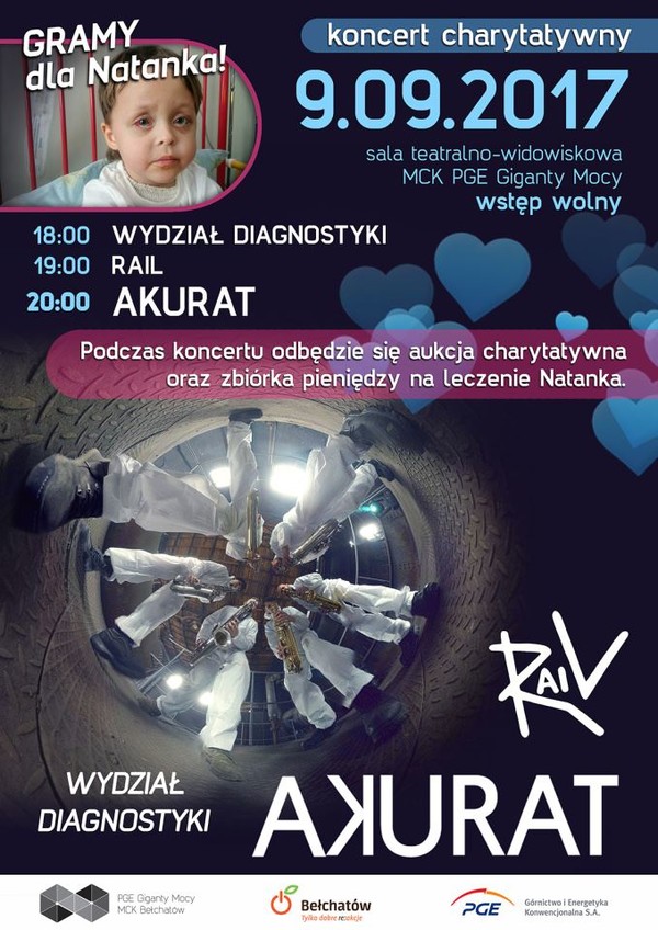 Miejskie Centrum Kultury w Bełchatowie zaprasza na koncert charytatywny, który odbędzie się 9 września o godzinie 18:00, w sali teatralno – widowiskowej MCK PGE Giganty Mocy. Na scenie wystąpią zespoły: Wydział Diagnostyki, RAIL oraz AKURAT.